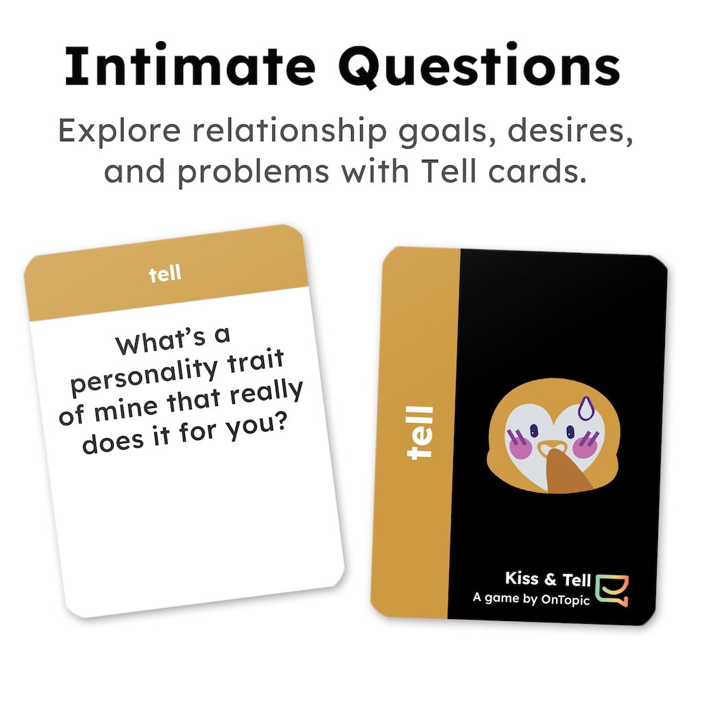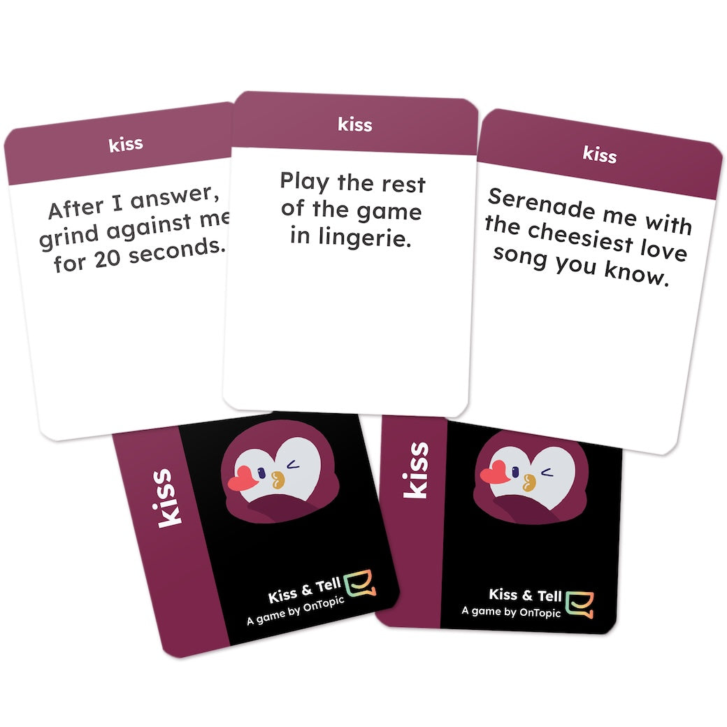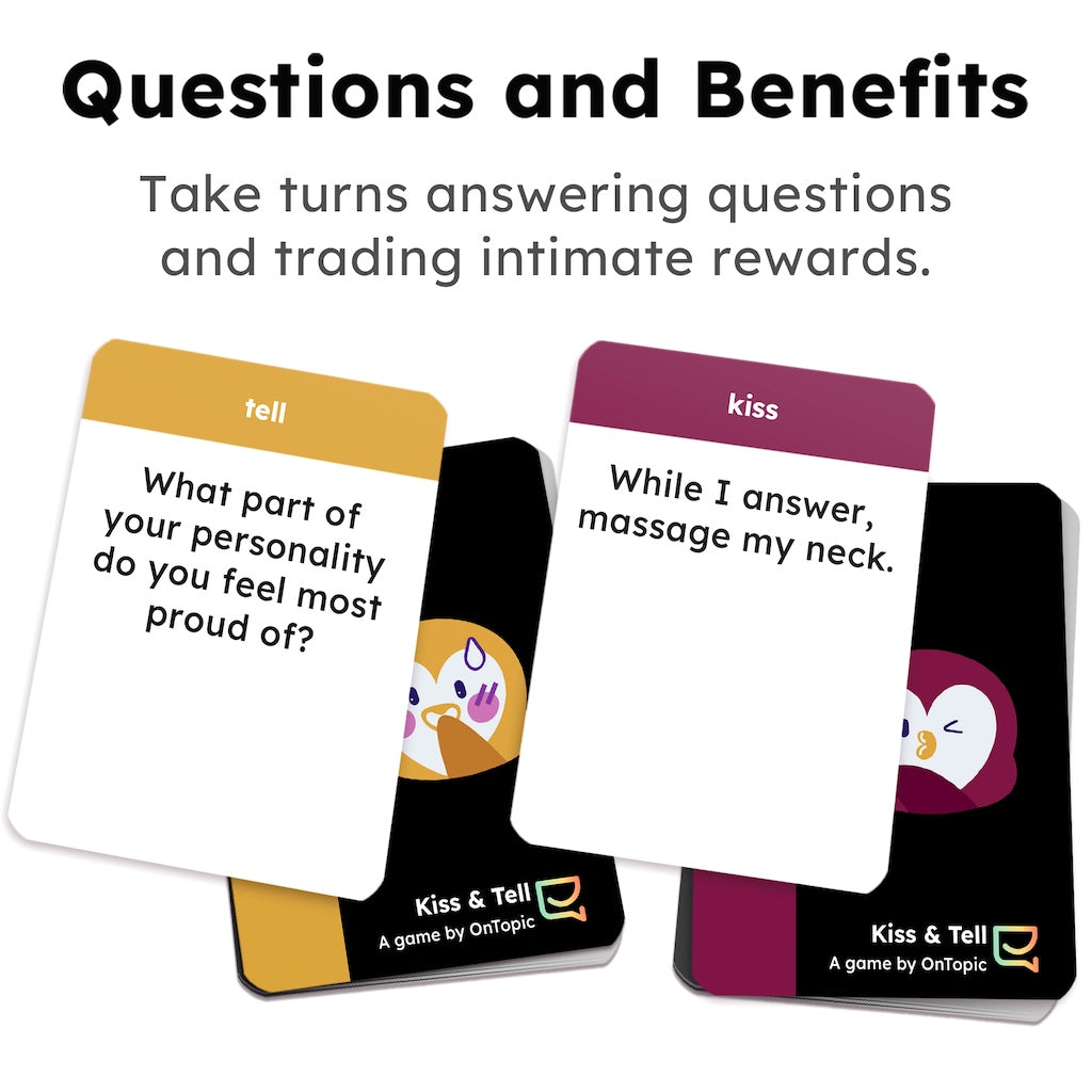 Standard conversation decks can feel like an interview. Kiss and Tell changes the vibe by adding a spark of physical connection or silliness to every answer. The flow is simple but electric: one person asks a meaningful question, and the other person decides the "reward" for answering it.